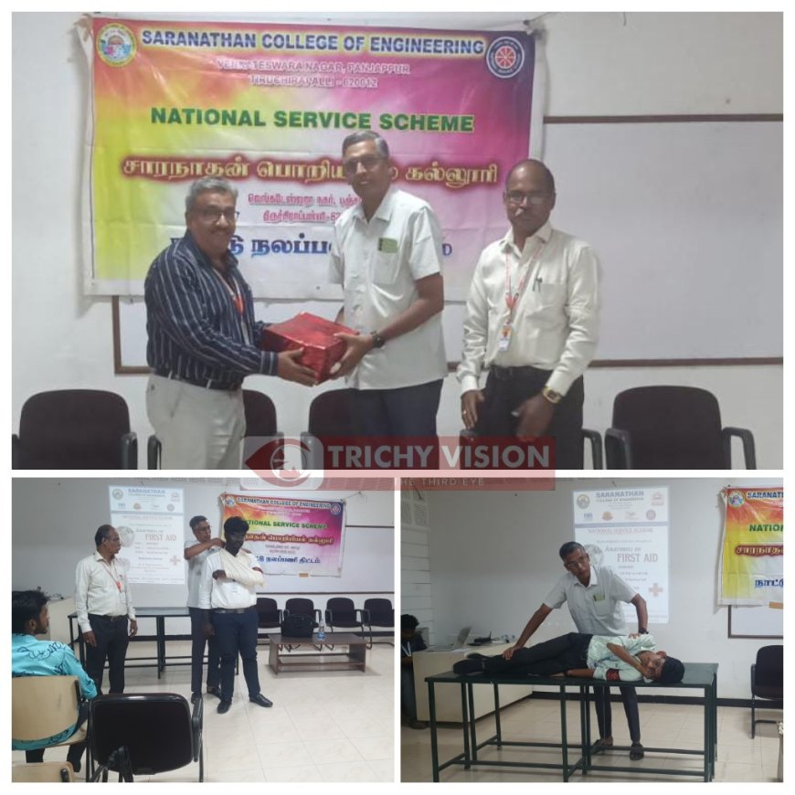 திருச்சி மாவட்டம், பஞ்சப்பூரில் அமைந்துள்ள சாரநாதன் பொறியியல் கல்லூரியின் நாட்டு நலப்பணித் திட்ட மாணவர்களுக்கு முதலுதவி முறைகள் குறித்த பயிற்சி முகாமானது (24-09-2024) அன்று நடைபெற்றது. இப்பயிற்சி முகாமிற்கு சாரநாதன் பொறியியல் கல்லூரியின் நாட்டு நலப்பணித்திட்ட அலுவலர் மு.கார்த்திகேயன் அவர்கள் தலைமை வகித்தார்.