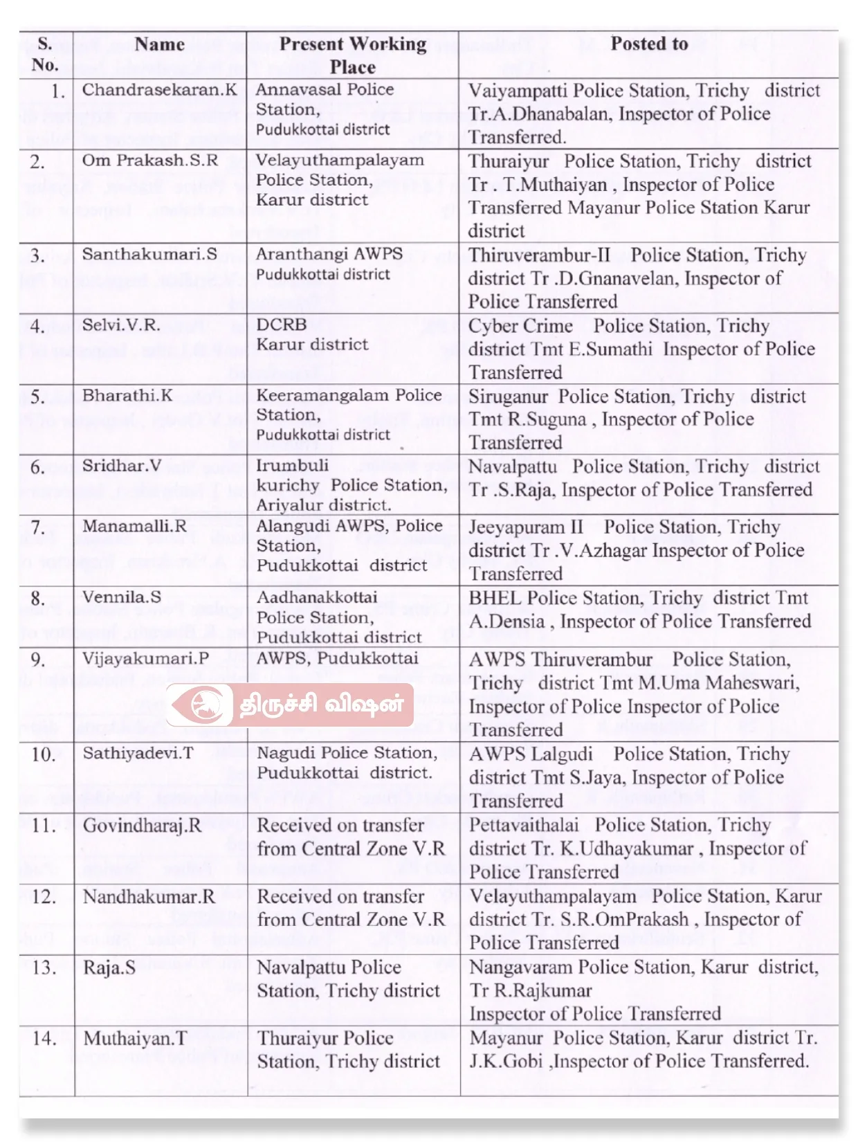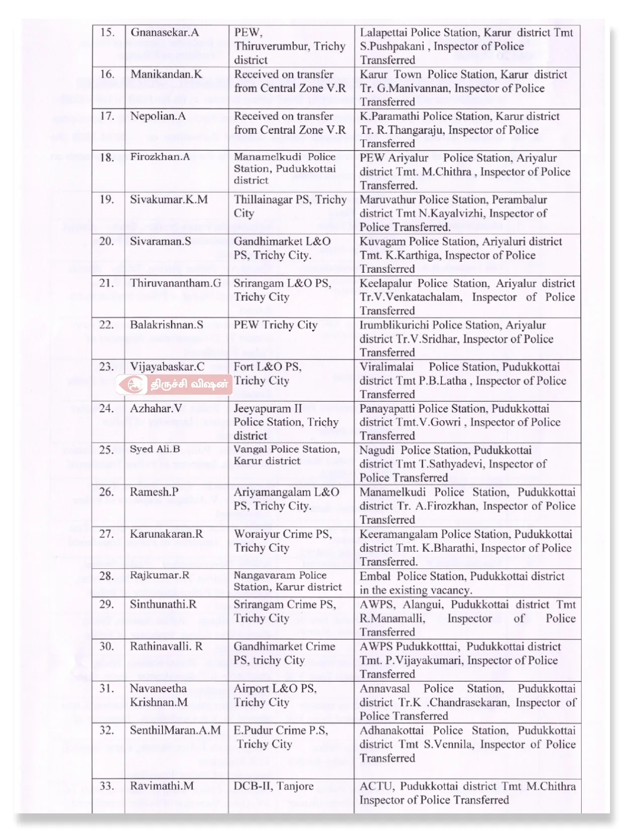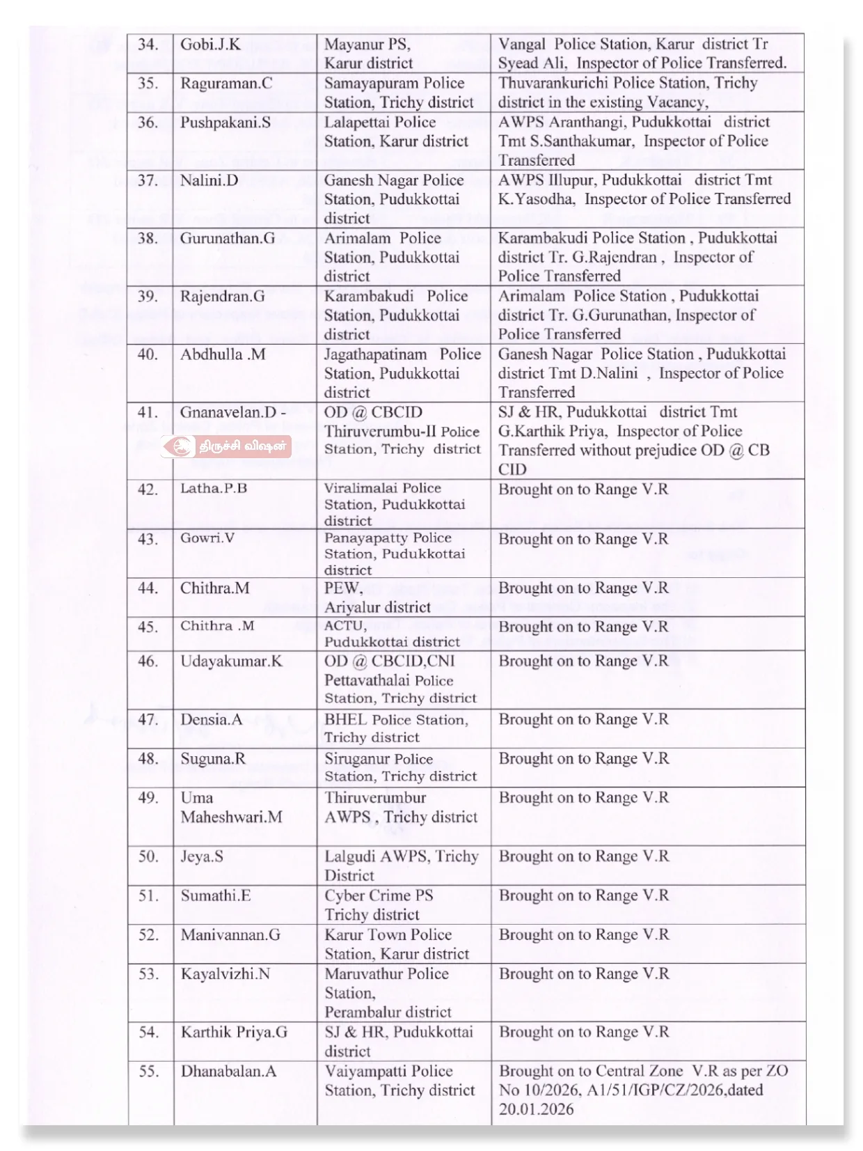 வரவிருக்கும் தேர்தலை முன்னிட்டு, காவல் துறையில் பணியாற்றி வரும் ஆய்வாளர்கள் (Inspector of Police) பலருக்கு இடமாற்றம் மற்றும் புதிய பணிநியமனங்கள் வழங்கப்பட்டுள்ளன.