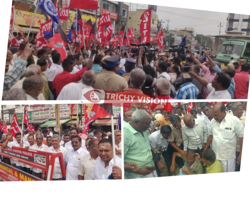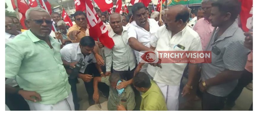 திருச்சி மத்திய பேருந்து நிலைய வாயிலில் போக்குவரத்து தொழிலாளர்கள் (ஏஐடியூசி, அண்ணா தொழிற்சங்கம் மற்றும் சிஐடியூ வினர்) பேருந்தை மறித்து போராட்டத்தில் ஈடுபட்டனர். பேருந்து நிலையத்திலிருந்து புறநகர் பேருந்துகள் வெளியே வர முடியாத அளவிக்கு சாலையில் அமர்ந்து போக்குவரத்து தொழிலாளர்கள் போராட்டத்தில் ஈடுபட்டு ஆறு அம்ச கோரிக்கைகளை நிறைவேற்றக்கோரி கோஷங்களை எழுப்பினர்.