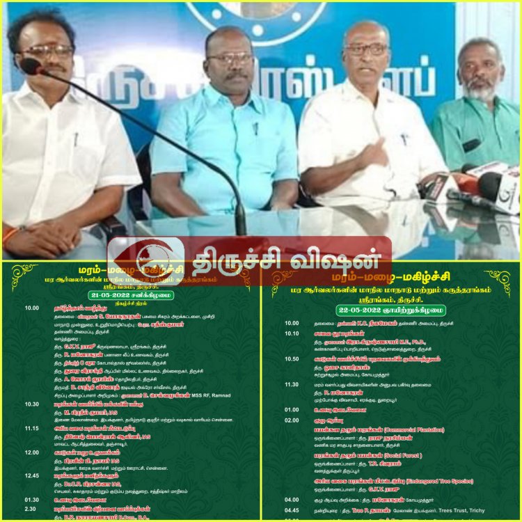 மரம் வளர்க்கும் அனைவரையும் ஒற்றுமைப் படுத்தி உறுதியான இயக்கமாக மாற்ற ஆர்வலர்களும் இந்த மாநில மாநாடு பேருதவியாக அமையும் இந்த மாநாடு மற்றும் கருத்தரங்கம் ஆனது மரம்-மழை- மகிழ்ச்சி என்ற தலைப்பில் வரும் 21, 22 ஆகிய தேதிகளில் காலை 10 மணி முதல் மாலை 5 மணி வரை ஸ்ரீரங்கம் கிருஷ்ணா மகாலில் நடைபெறுகிறது.