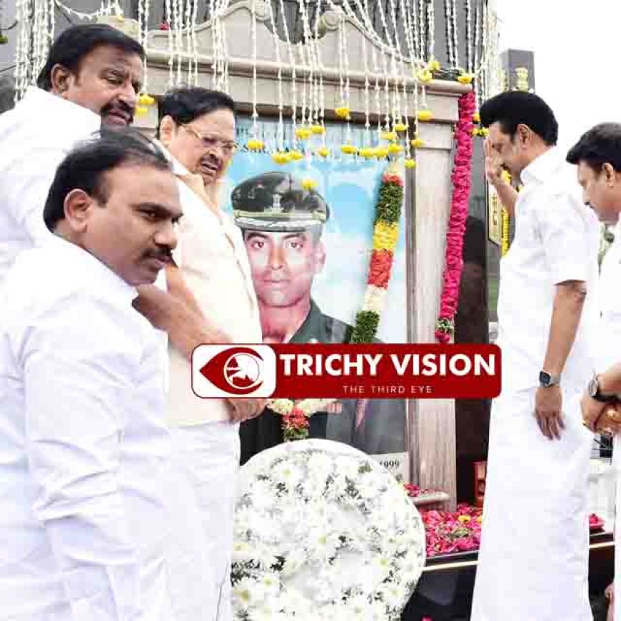 திருச்சி வெஸ்ட்ரி பள்ளி அருகே அமைந்துள்ள ரவுண்டானாவில் கார்கில் போர் வெற்றி தினத்தையொட்டி கார்கில் போரில் வீர மரணமடைந்த மேஜர் சரவணன் நினைவு ஸ்தூபியில் தமிழக முதல்வர் ஸ்டாலின், நீர்வளத்துறை அமைச்சர் துரைமுருகன், நகராட்சி நிர்வாக துறை அமைச்சர் நேரு பள்ளிக்கல்வித்துறை அமைச்சர் மகேஸ், பாராளுமன்ற உறுப்பினர் ராசா உள்ளிட்ட திமுகவினர் முதல்வருடன் மரியாதை செய்தனர்.