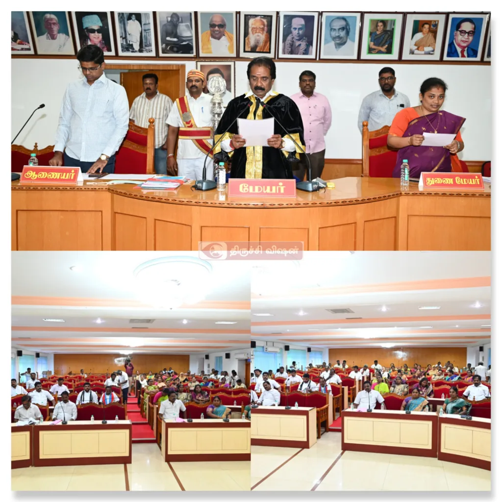 திருச்சிராப்பள்ளி மாநகராட்சி மாமன்ற சாதாரணக்கூட்டம் மேயர் மு.அன்பழகன் அவர்கள் தலைமையில், துணை மேயர் ஜி.திவ்யா,துணை ஆணையர் க .பாலு ஆகியோர் முன்னிலையில் இன்று 30.09.2025 நடைபெற்றது.இக்கூட்டத்தில் மண்டலத் தலைவர்கள் ஆண்டாள் ராம்குமார், துர்காதேவி, பி.ஜெயநிர்மலா,  மாமன்ற உறுப்பினர்கள் மற்றும், நகர் நல அலுவலர், செயற்பொறியாளர்கள், மாநகராட்சி உதவி ஆணையர், உதவி செயற்பொறியாளார்கள், சுகாதார அலுவலர்கள் கலந்து கொண்டார்கள்.திருச்சி மாநகராட்சி கூட்டத்தில் கரூர் கூட்ட நெரிசலில் உயிரிழந்தவர்களுக்கு 2 நிமிட மௌன அஞ்சலி. மேலும் பாதாள சாக்கடை பணியில் ஈடுபட்ட இரண்டு பேர் இறந்த நிலையில், அவர்களுக்கும் சேர்த்து அஞ்சலி செலுத்துவோம் என கவுன்சிலர் கோரிக்கையை ஏற்று அவர்களுக்கும் மௌன அஞ்சலி செலுத்தப்பட்டது.