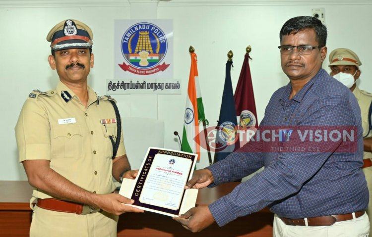 ஆய்வாளர் ஆகியோர்களை திருச்சி மாநகர காவல் ஆணையர் நேரில் அழைத்து பணிப்பாராட்டு சான்றிதழ் மற்றும் பண வெகுமதி அளித்து வெகுவாக