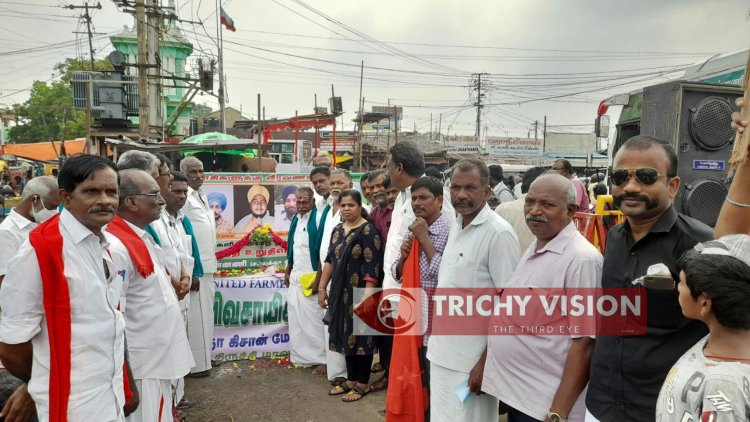 அந்த வகையில் உயிர்நீத்த விவசாயிகளின் அஸ்தி ஆனது இன்று திருச்சி கொண்டு வரப்பட்டது. காந்தி மார்க்கெட்டில் நடந்த அஸ்தி வீரவணக்க நிகழ்ச்சியில் விவசாய சங்க பிரதிநிதிகள், அரசியல் கட்சி பிரமுகர்கள், பொதுமக்கள், கூலி தொழிலாளர்கள் என பலரும் கலந்துகொண்டு அஸ்திக்கு மலர்தூவி மரியாதை செலுத்தினர். தொடர்ந்து வீரவணக்கம் முழக்கம் எழுப்பினர்.