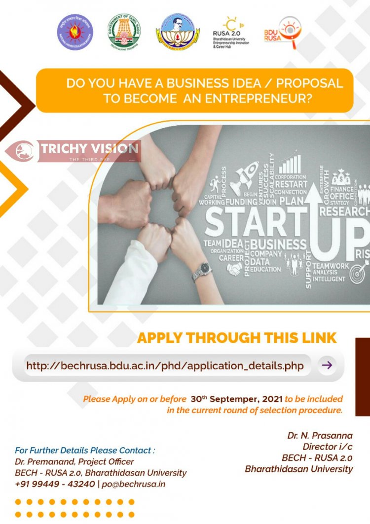 இன்றைக்கு பலருக்கும் தொழில் முனைவோராக ஆக வேண்டும் என்ற எண்ணம் இருக்கிறது அதற்கான பல நல்ல திட்டங்களும் இருக்கின்றன ஆனால் அது எவ்வாறு ஆரம்பிப்பது அதற்கான முதலீடு எவ்வாறு செய்வது என்ற தயக்கத்தில் பலர் இருக்கின்றனர். அவர்களுக்கு உதவும் வகையில் திருச்சி பாரதிதாசன் பல்கலைக்கழகத்தில் திட்ட துறையை சேர்ந்தவர்கள் ஒரு புது முயற்சியை தொடங்கியுள்ளனர். பல்கலைக்கழகத்தின் துணைவேந்தர் டாக்டர்.எம்.செல்வம் கூறுகையில், பாரதிதாசன் பல்கலைக்கழக தொழில் முனைவோர், புதுமை மற்றும் தொழில் மையம் (BECH) ஜூலை 2019 முதல் RUSA- கட்டம் 2.0 இன் கீழ் நிறுவப்பட்டது.