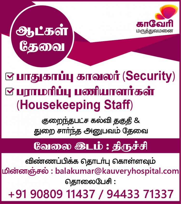 திருச்சியில் உள்ள காவேரி மருத்துவமனைக்கு கீழ்கண்ட பணியிடங்களுக்கு வேலைவாய்ப்புகள் அறிவிக்கப்பட்டுள்ளன.