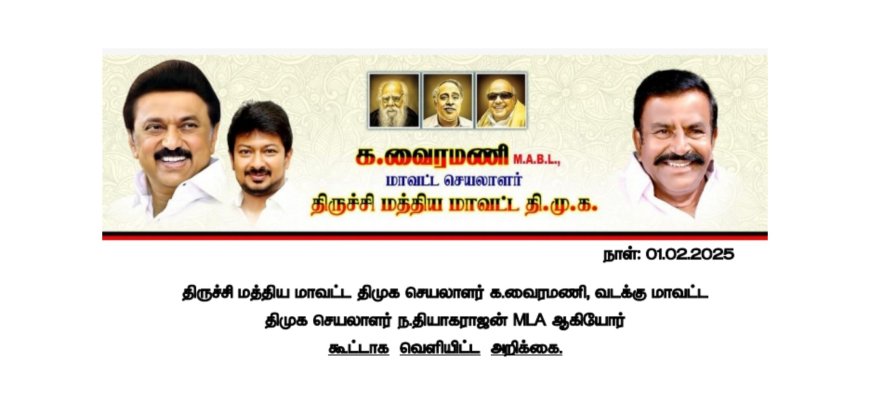 தி.மு.கழக தலைவரும், தமிழக முதல்வருமான, அண்ணன் மாண்புமிகு தளபதி அவர்கள் மணப்பாறையில் நடக்கும் பாரத சாரண சாரணியர் வைர விழாவில் கலந்து கொள்வதற்காக (02.02.2025)ம் நாள் ஞாயிற்றுக்கிழமை காலை 11:00 மணியளவில் விமானம் மூலம் திருச்சிக்கு வருகை தர விருக்கின்றார். திருச்சிக்கு வருகை தரும் முதல்வர் அவர்களுக்கு திருச்சி விமான நிலையத்தில் கழக முதன்மை செயலாளரும், நகராட்சி நிர்வாக துறை அமைச்சருமான மாண்புமிகு அண்ணன் கே.என்.நேரு அவர்கள் தலைமையில் திருச்சி மத்திய, வடக்கு மாவட்ட திமுக சார்பில் உற்சாக வரவேற்பு அளிக்கப்படுகின்றது.