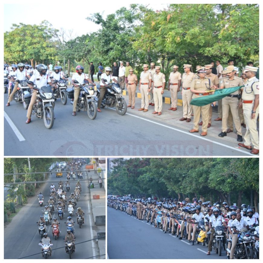 திருச்சி மாநகரத்தில் சாலை பாதுகாப்பு மாதத்தை முன்னிட்டு பொதுமக்களிடம் சாலை பாதுகாப்பு விழிப்புணர்வு குறித்தும், தலைக்கவசம் (Helmet) அணிவதன் முக்கியத்துவம் பற்றிய விழிப்புணர்வு ஏற்படுத்தும் வகையில், இன்று (01.02.2025)-ந் தேதி அமர்வு நீதிமன்ற காவல்நிலைய எல்லைக்குட்பட்ட எம்.ஜி.ஆர் சிலையிலிருந்து இருந்து இருசக்கர வாகன பேரணியை திருச்சி மாநகர காவல் ஆணையர் ந.காமினி கொடியசைத்து தொடங்கி வைத்தார் .
