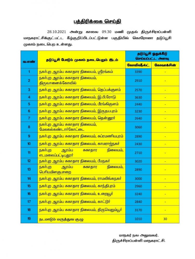 திருச்சி மாநகரில் இன்று (28.10.2021) கோவிசீல்டு தடுப்பு ஊசிகள் போடப்படும் இடங்களை மாநகராட்சி நிர்வாகம் அறிவித்துள்ளது.
