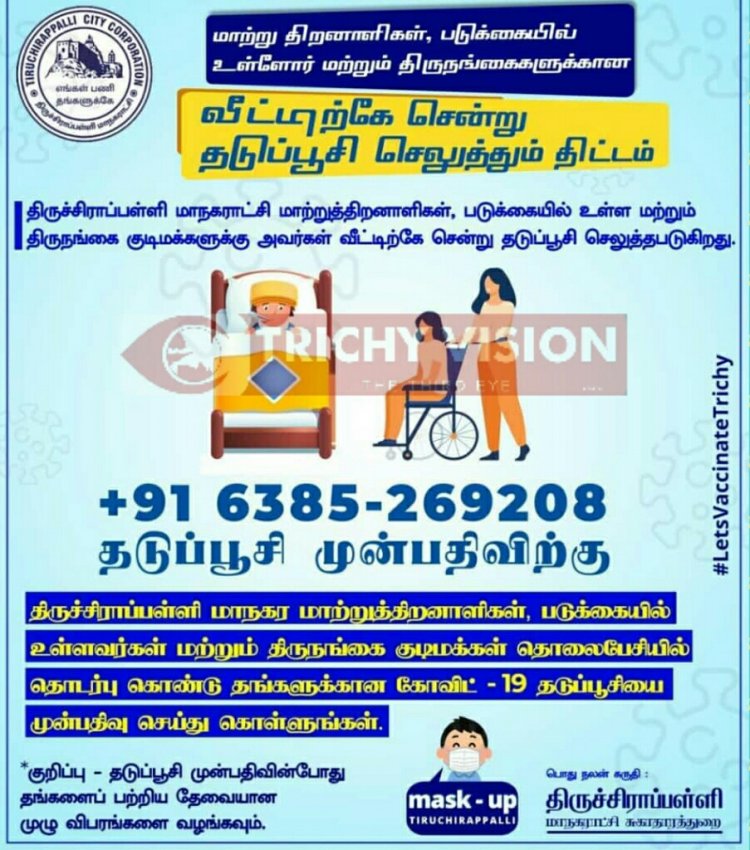 இதில் மாற்றுத்திறனாளிகள், முதியவர்கள் பெண்களுக்கென சிறப்பு முகாம்கள் அவ்வபோது நடத்தப்படுகிறது. இதில் குறிப்பாக திருச்சி மாநகர பகுதிகளில் வசிக்கும் முதியோர்கள் மற்றும் திருநங்கைகள் மற்றும் மாற்றுத்திறனாளிகள் ஆகியோர் படுக்கையில் உள்ளவர்களுக்கு வீட்டிற்கே சென்று தடுப்பூசி செலுத்தும் திட்டத்தை திருச்சி மாநகராட்சி அறிவித்துள்ளது.