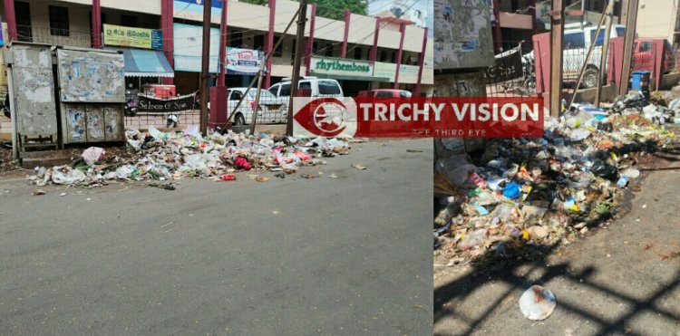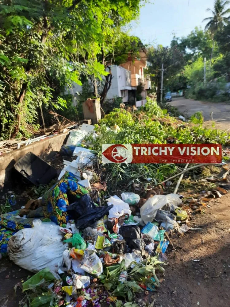 இதே போன்று திருச்சி மத்திய பேருந்து நிலையம் அருகில் பிரதான சாலையில் தபால் நிலையம் எதிரில் குப்பைகள் கொட்டப்படுகிறது. இதில் உணவு கழிவுகள், பிளாஸ்டிக் பொருட்கள் அதிகளவு கொட்டப்படுகிறது. மேலும் கால்நடைகள் இங்கு எப்பொழுது குப்பைகளை திண்பதற்காக நிற்கிறது.