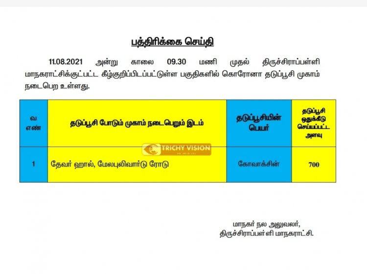 திருச்சி மாவட்டத்தில் நாளை (11.08.2021) கோவாசின் 700தடுப்பூசிகள் போடப்படும் என மாநகராட்சி நிர்வாகம் தெரிவித்துள்ளது.