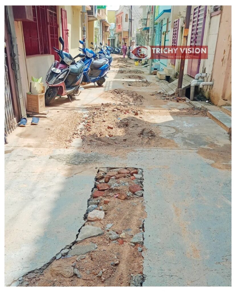 திருச்சி மாநகராட்சியில் வார்டு 33,(துணை மேயர் திவ்யா தனக்கொடி வார்டு செக்கடித் தெரு) இந்த வார்டில் தண்ணீர் குழாய் பதிக்கும் பணி முடிந்து ஒரு மாதம் ஆகிவிட்டது. தெருவில் தோண்டிய பள்ளங்கள் சரியாக மூடாமல் இருக்கிறது.