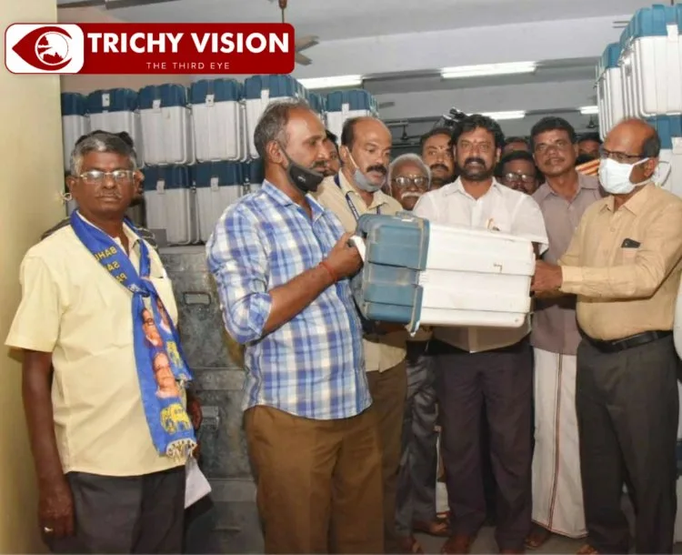 2021 தமிழக சட்டமன்ற தேர்தல் வரும் ஏப்ரல் 6 ஆம் தேதி நடைபெற உள்ள நிலையில் திருச்சி மாவட்டத்திற்குட்பட்ட 9 சட்டமன்ற தொகுதிகளுக்கும் மின்னணு வாக்குப்பதிவு இயந்திரங்கள் அனுப்பும் பணி துவங்கியது. முன்னதாக மாவட்ட ஆட்சியர் அலுவலக வளாகத்தில் பாதுகாப்பு அறையில் வைக்கப்பட்டிருந்த மின்னணு வாக்குப்பதிவு இயந்திரங்கள் அங்கீகரிக்கப்பட்ட அனைத்து கட்சி பிரதிநிதிகள் முன்பாக திறக்கப்பட்டு இயந்திரங்கள் லாரிகள் மூலம் அனுப்பி வைக்கப்பட்டது.