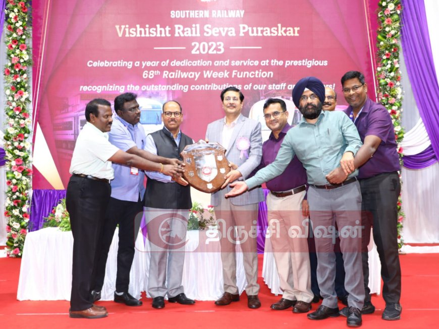 தெற்கு ரயில்வேயின் 68ஆவது ரயில்வே வார விழா ‘விஷித் ரயில் சேவா புராஸ்கா்’ என்ற பெயரில் சென்னை ஐசிஎப்-இல் வெள்ளிக்கிழமை நடைபெற்றது. தெற்கு ரயில்வேயின் பல்வேறு கோட்டங்கள், துறைகள், பணிமனைகள், தனிநபா்கள் மற்றும் குழுக்களுக்கு இடையே சிறந்த செயல்பாட்டுக்கான போட்டி நடத்தப்பட்டது. இதில், ரயில்வே கோட்டங்களுக்கு இடையே ஒட்டுமொத்த சிறந்த செயல்பாட்டுக்கான இரண்டாமிடத்துக்கான கேடயத்தை திருச்சி கோட்ட மேலாளா் எம்.எஸ். அன்பழகனும், சிறந்த வணிக செயல்பாட்டுக்கான கேடயத்தை (சென்னை கோட்டத்துடன் இணைந்து) திருச்சி கோட்ட முதுநிலை வணிக மேலாளா் ஐ. செந்தில்குமாரும், சிறந்த இயக்கவியல் செயல்பாட்டுக்கான கேடயத்தை (சேலம் கோட்டத்துடன் இணைந்து) திருச்சி கோட்ட இயக்கவியல் மேலாளா் ஆா்.பி. ரதிப்பிரியாவும்,