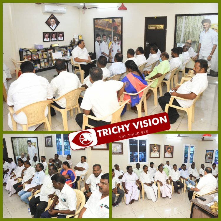 திருச்சி தெற்கு மாவட்ட கழக அலுவலகத்தில் நடைபெற இருக்கின்ற நகர்ப்புற உள்ளாட்சி தேர்தலில் கழக நிர்வாகிகள் ஆற்ற வேண்டிய பணிகள் குறித்து தேர்தல் பொறுப்பாளர் ஆலோசனை கூட்டம் தெற்கு மாவட்ட கழக பொறுப்பாளரும் பள்ளிக்கல்வித் துறை அமைச்சருமான அன்பில் மகேஷ் பொய்யாமொழி வழிகாட்டுதலின் பேரில் நடைபெற்றது
