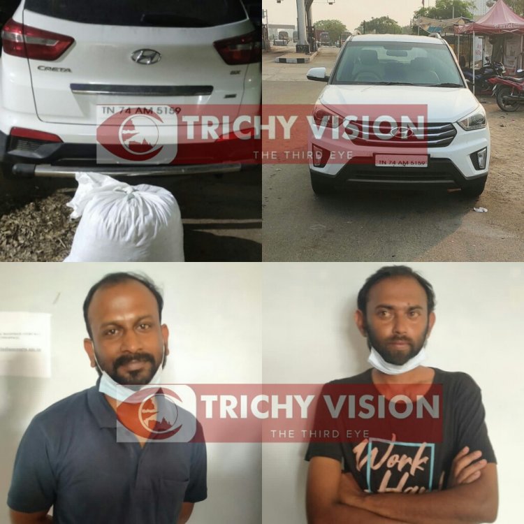 அப்போது சமயபுரம் டோல் பிளாசா அருகே போதைப்பொருள் கடத்தல் தடுப்பு பிரிவு போலீசார் வாகன சோதனையில் ஈடுபட்ட போது தமிழக பதிவு எண் கொண்ட சொகுசு காரை சோதனையிட்டனர். அந்த காரில் வெள்ளை உரை சாக்குப்பையில் காரின் பின்புறம் ஒளித்து வைத்து எடுத்து வந்த 22 கிலோ எடையுள்ள கஞ்சா இருந்தது கண்டுபிடிக்கப்பட்டது. பின்னர் காரில் இருந்த 2 பேரை பிடித்து விசாரணை நடத்தியதில் கஞ்சா கடத்தல் கும்பலை சேர்ந்த தலைவன் தேனி மாவட்டம் தேவாரம் என்ற ஊரைச் சேர்ந்த ஆசை (வயது 34) மற்றும் புவனேஸ்வரன் (வயது 32) ஆகிய இருவரும் ஆந்திராவிலிருந்து கஞ்சா கடத்தி வந்ததது தெரியவந்தது.