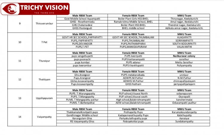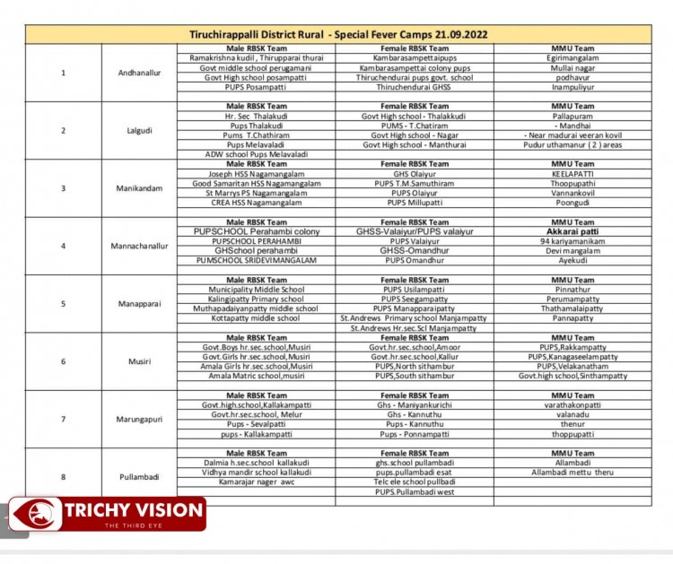 1000 இடங்களில் தமிழகம் முழுவதும் காய்ச்சல் முகாம் நடைபெற்று வருகிறது. திருச்சி மாவட்டத்தில் இன்று காலை 8 மணி முதல் காய்ச்சல் பரிசோதனை முகாம் நடைபெற்று வருகிறது காய்ச்சல் பரிசோதனை முகாம் நடைபெறும் இடங்கள்: