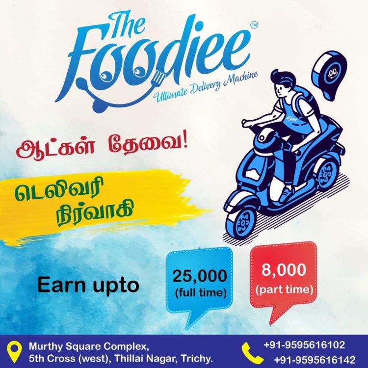 திருச்சி தில்லைநகரில் இயங்கக்கூடிய FOODIEE நிறுவனத்திற்கு ஆட்கள் தேவை .பகுதி நேரமாகவோ, முழு நேரமாகவோ டெலிவரி நிர்வாகியாக பணிபுரிய விண்ணப்பங்கள் வரவேற்கப்படுகின்றன. மேலும் கூடுதல் தகவல்களைப் பெற கீழ்க்கண்ட தொலைபேசி எண்களில் தொடர்பு கொள்ளவும் .மாதம் பகுதிநேர டெலிவரி நிர்வாகிக்கு 8ஆயிரம் ரூபாய் சம்பளமும், முழுநேர பணிக்கு 25 ஆயிரம் ரூபாய் சம்பளமும் வழங்கப்படும்.