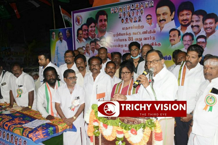 திருச்சி மாநகராட்சி 31வது வார்டில் போட்டியிடும் காங்கிரஸ் வேட்பாளர் சுஜாதாவை ஆதரித்து வரகனேரியில் முன்னாள் மத்திய நிதியமைச்சர் ப.சிதம்பரம் பேசினார். அப்போது பேசிய அவர்… ஈபிஎஸ், ஓபிஎஸ் இருவரும் முதலமைச்சராக இருந்து ஏன் உள்ளாட்சித் தேர்தலை நடத்தவில்லை. ஏன் ஐந்தாண்டுகளுக்கு ஒருமுறை நடத்த வேண்டிய தேர்தலை நடத்த வில்லை. இதற்கு பதில் கூறிவிட்டு ஆளுங்கட்சியை பார்த்து கேள்வி கேளுங்கள். திமுக ஆட்சிக்கு வந்தால் ஒரு வருடத்திற்குள் உள்ளாட்சி தேர்தல் நடத்துவோம் என்று கூறினார்கள் அதை நிறைவேற்றிக் கொண்டிருக்கிறார்கள். அந்த உள்ளாட்சி தேர்தல் பரப்புரை மேடையில் தான் தற்பொழுது இபிஎஸ், ஓபிஎஸ் கேள்வி கேட்கிறார்கள்.