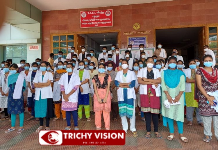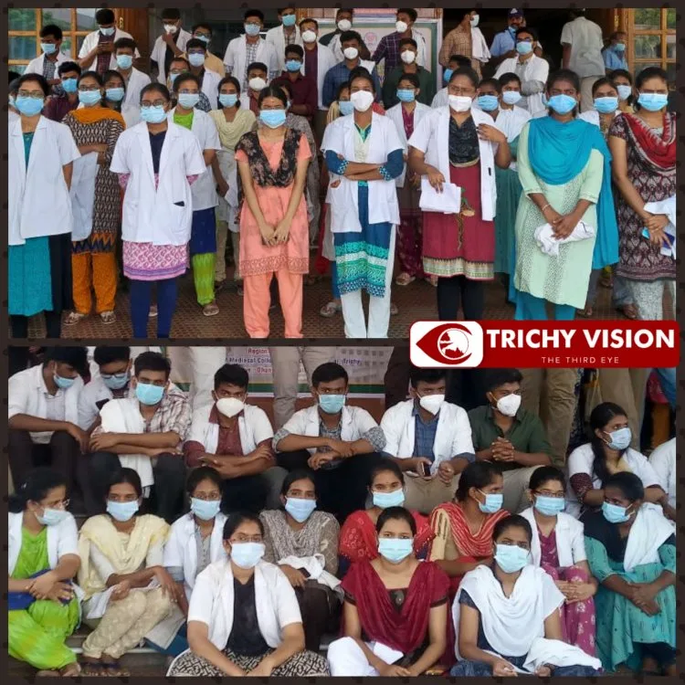 திருச்சி அரசு மருத்துவமனையில் பணிபுரியும் இளநிலை பயிற்சி மருத்துவர்கள் 150க்கும் மேற்பட்டோர் பணி புறக்கணிப்பு போராட்டத்தில் ஈடுபட்டுள்ளனர்.