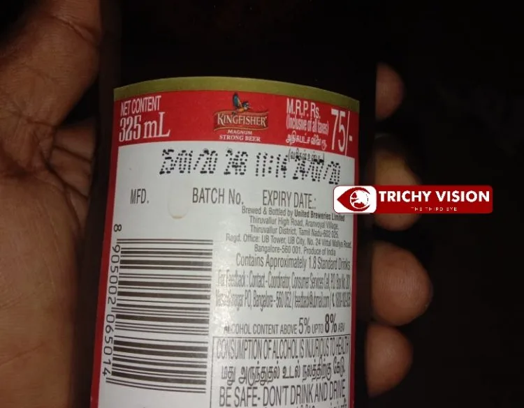 அந்தவகையில் திருச்சி உறையூர் பகுதியில் உள்ள இரண்டாவது மதுபான கடையில் அதே உறையூர் பகுதியைச் சேர்ந்த ஒருவர் மினி பீர் இரண்டை வாங்கியுள்ளார். கூட்ட நெரிசலில் அதனை எப்படியோ வாங்கிக்கொண்டு வீட்டிற்கு சென்று பார்த்தபோது அது காலாவதியாகி உள்ளதை கண்டு அதிர்ச்சி அடைந்துள்ளார். அந்த காலாவதியாகிய பீர் பாட்டில் கடந்த வருடம் ஏழாம் மாதத்தில் தயாரிக்கப்பட்டது என்று தெரியவந்துள்ளது. உடனடியாக யூபில் எண்ணிற்கு அழைப்பு விடுத்தபோது அவர்களிடம் இருந்து சரியான பதில் எதுவும் கிடைக்காததால் பாட்டிலை தூக்கிபோட்டுவிட்டார்.