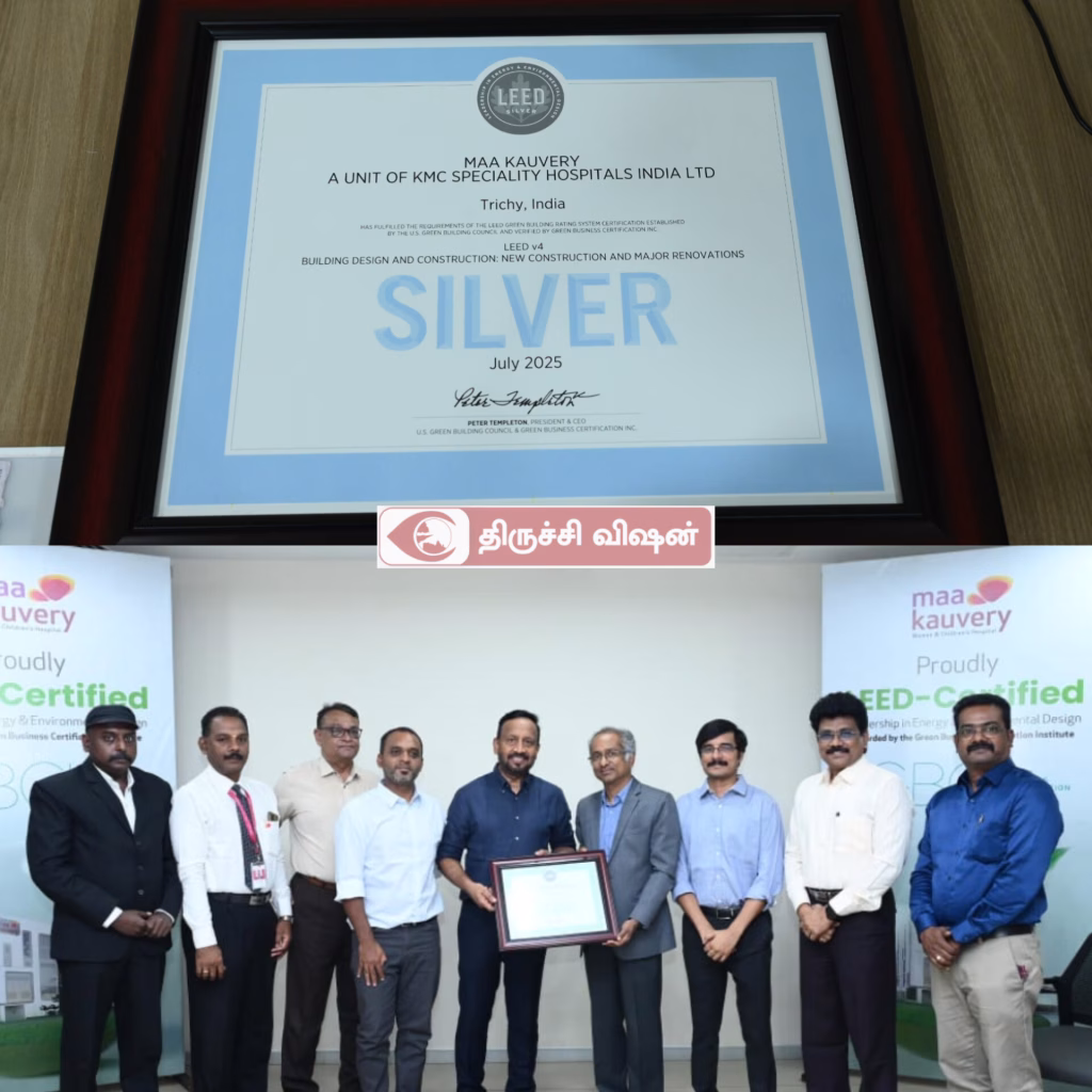 திருச்சி மா காவேரி மருத்துவமனைக்கு GBCI வழங்கும் LEED சில்வர் பசுமை சான்றிதழ் பெற்று சாதனை