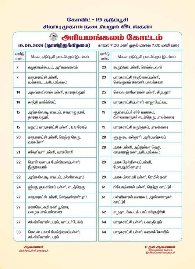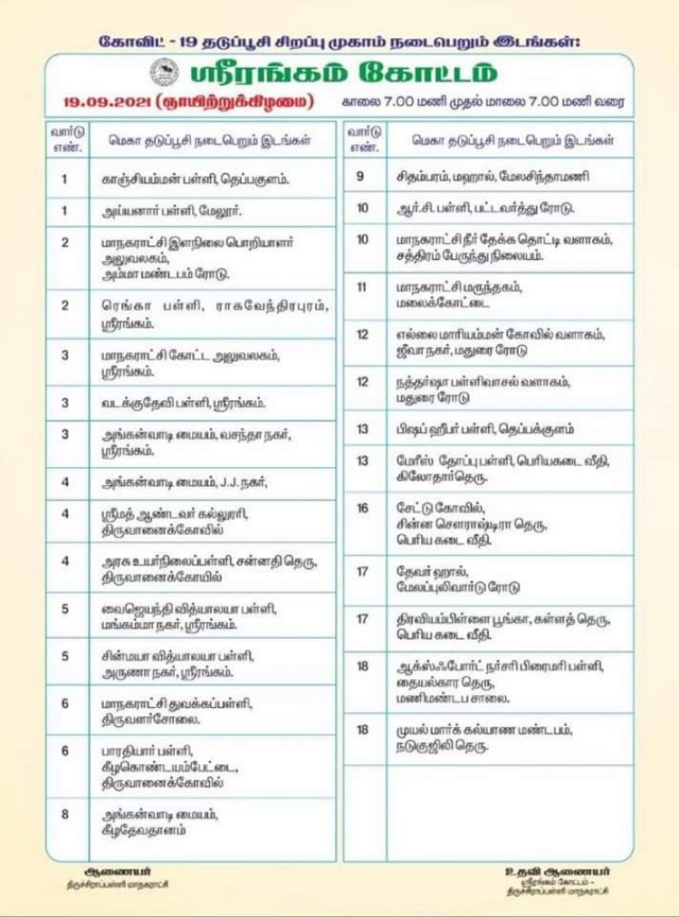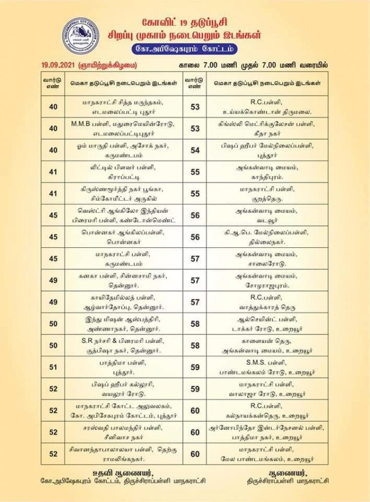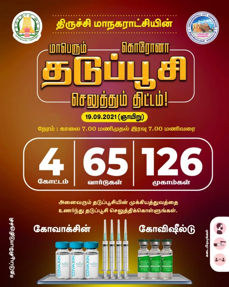 இந்நிலையில் திருச்சிராப்பள்ளி மாநகராட்சியில் கீழ்குறிப்பிட்டுள்ள 126 இடங்களில் 19.09.2021 அன்று காலை 7.00 மாலை முதல் 7.00 வரை மாபெரும் கொரோனா தடுப்பூசி முகாம் நடைபெற உள்ளது.