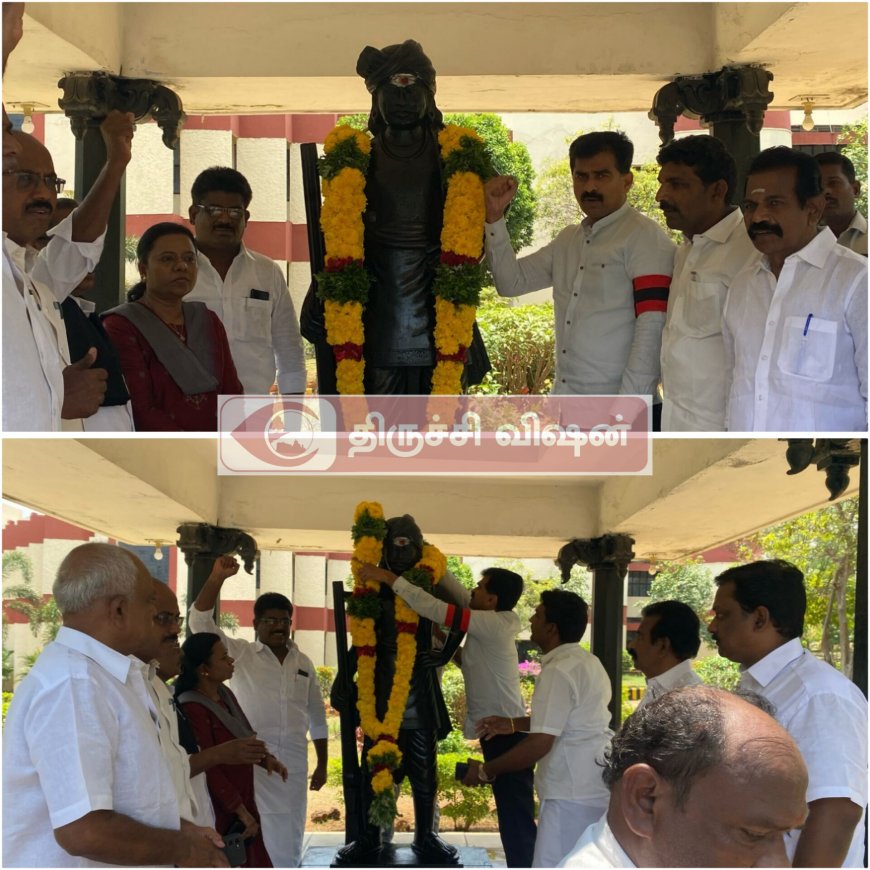 அப்போது, நாம் எல்லோரும் ஒற்றுமையோடு ஒன்றிணைந்து நாட்டின் முன்னேற்றத்திற்கு பாடுபடுவோம் என்று தீரன் சின்னமலை அவர்களின் பிறந்த நாளில் சபதம் ஏற்றோம்.  இந்நிகழ்வில், கழக துணைப் பொதுச் செயலாளர் டாக்டர் ரொஹையா, மாவட்ட செயலாளர்கள் திருச்சி மாநகர் வெல்லமண்டி சோமு, திருச்சி புறநகர் தெற்கு மணவை