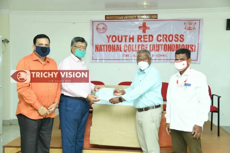 இந்த சமூக சேவையில் திருச்சி தேசியக் கல்லூரியில் இளைஞர் செஞ்சிலுவை சங்கம் இணைய முடிவெடுத்தது கல்லூரியின் சார்பாக 2000 அறுவை சிகிச்சை முக கவசம் பல்கலைக்கழக முனைவர் ஜி. கோபிநாத்திடம் கல்லூரி முதல்வர் முனைவர் ஆர்.சுந்தரராமன் வழங்கியுள்ளார்.
