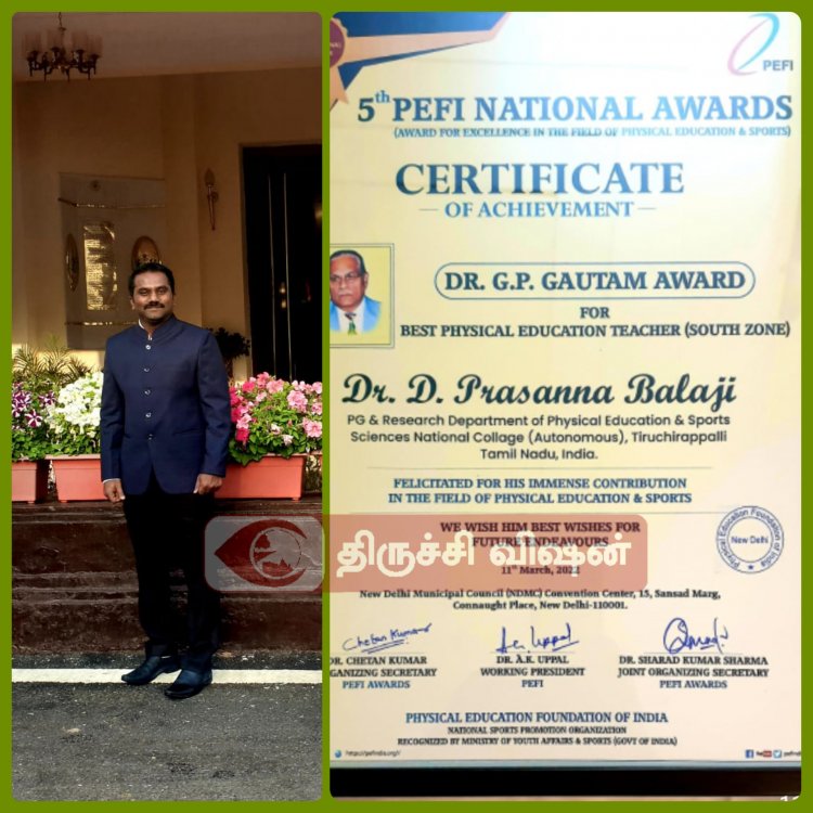 இந்த நிலையில் பிசிக்கல் எஜுகேஷன் பவுண்டேஷன் ஆஃப் இந்தியா (PEFI)சார்பாக ஐந்தாவது முறையாக நடைபெறும் இவ்விருது விழாவில்  உடற்கல்வி துறையில் சிறந்து செயல்பட்டதற்காக இந்த வருடம் முழுவதும் சிறப்பாக செயல்பட்டதாகவும் தேசிய அளவில் திருச்சி தேசிய கல்லூரி துணை முதல்வரும் உடற்கல்வி துறை தலைவருமான டாக்டர் பிரசன்னபாலாஜி விருதுக்கு தேர்வு செய்யப்பட்டார்.