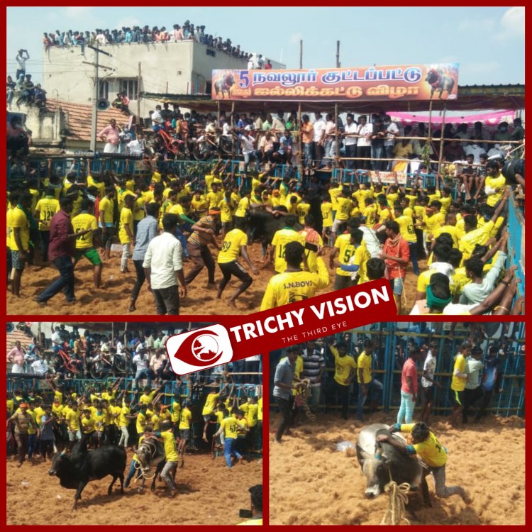 பொங்கல் பண்டிகையையொட்டி திருச்சி மாவட்டம் ஸ்ரீரங்கம் தொகுதிக்குட்பட்ட ராம்ஜிநகர் அடுத்துள்ள நவலூர்குட்டப்பட்டு கிராமத்தில் இன்று காலை 7.30 மணிக்கு ஜல்லிக்கட்டு போட்டி தொடங்கப்படும் அறிவிக்கப்பட்ட நிலையில், காலதாமதமாக 10:30 மணிக்கு தான் ஜல்லிக்கட்டு போட்டி துவங்கியது. போட்டியை ஒன்றிய பெருந்தலைவர் கருப்பையா கொடியசைத்து துவக்கி வைத்தார்.இந்த ஜல்லிக்கட்டில் 300 காளைகளும், 300 மாடுபிடி வீரர்களும் பங்கேற்கின்றனர்.