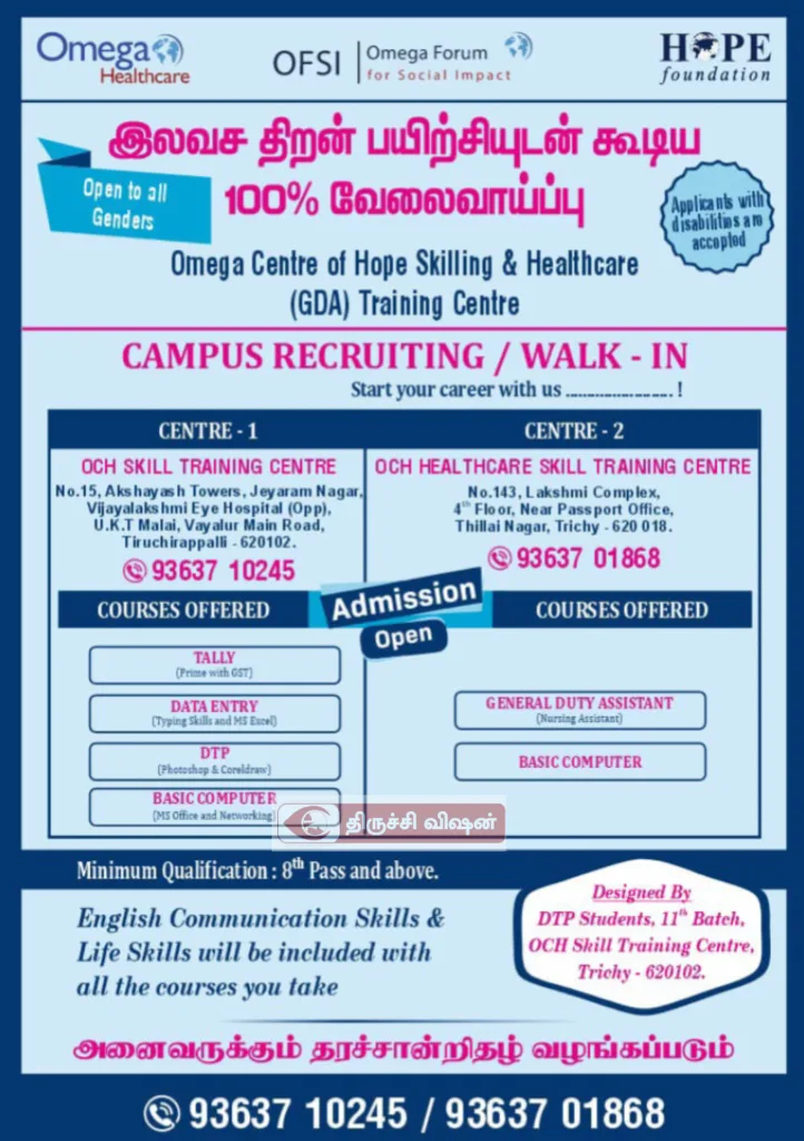 இலவச திறன் பயிற்சியுடன் கூடிய 100% வேலை வாய்ப்பை ஒமேகா சென்டர் ஆப்ஹோப் பயிற்சி நிறுவனமானது கடந்த 2022 ஏப்ரல் முதல் உய்யக்கொண்டான் திருமலை வயலூர் மெயின் ரோடு திருச்சியில் செயல்பட்டு வருகிறது. இந்த பயிற்சி நிறுவனத்தில் Tally, Data Entry, DTP, Basic Computer, GDA – General Duty Assistant மற்றும் English Language Communication. இதன் மூலம் இதுவரையில் சுமார் 1500-க்கும் மேற்பட்ட இளைஞர்களுக்கு வேலைவாய்ப்பினை உறுதி செய்து, அவர்களின் வாழ்க்கை மற்றும் வாழ்வாதாரம் முன்னேறுவதற்கு ஒரு காரணமாக இருந்து வருகிறது.