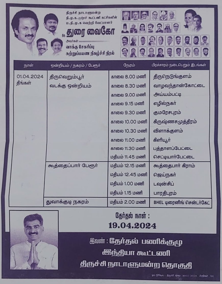 இதன் ஒரு பகுதியாக நாளை (01.04.2024) திருச்சி நாடாளுமன்ற தொகுதியில் வாக்கு சேகரிப்பு சுற்றுப்பயணம் குறித்த இடங்கள் அறிவிக்கப்பட்டுள்ளன.