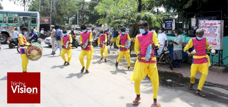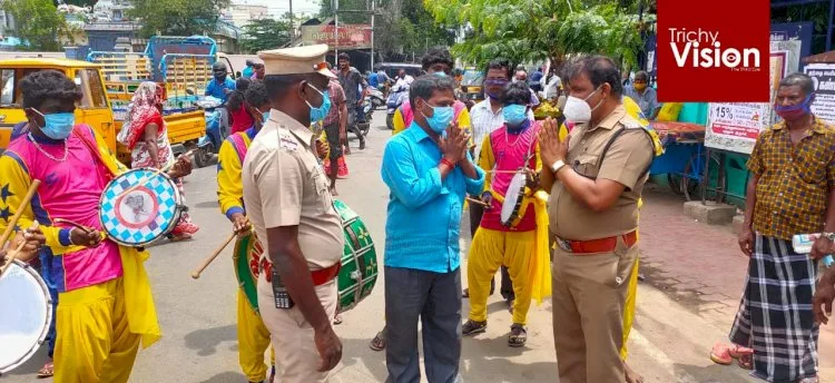 திருச்சி கொரோனா இல்லாத மாவட்டமாக மாற்றுவதற்காக திருச்சி மாவட்ட நிர்வாகமும் திருச்சி காவல்துறையினர் பல்வேறு முன்னெடுப்புகளை நடத்தி வருகின்றனர். அந்த வகையில் இன்று திருச்சி அரசு மருத்துவமனை மற்றும் புத்தூர் ஆகிய பகுதிகளில் பொதுமக்களுக்கு சானிடைசர், முக கவசம் அணிவது மற்றும் தனிமனித இடைவெளி ஆகியவை பற்றி பாரம்பரிய நாட்டுப்புற இசை கலைஞர்கள் தப்பாட்டம் அடித்து விழிப்புணர்வு ஏற்படுத்தினர்.