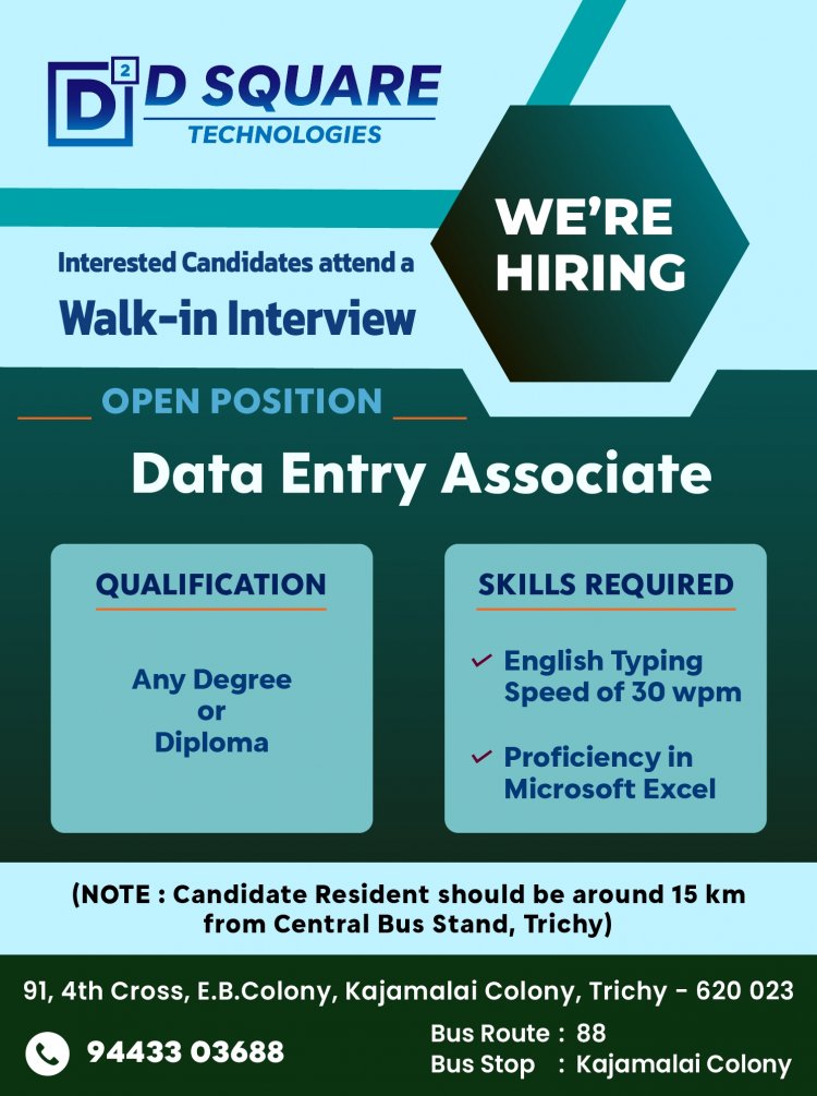 திருச்சி காஜாமலை பகுதியில் செயல்பட்டு வரும் DSquare Technologies நிறுவனத்தில் Data Entry Associate பணியிடங்களுக்கு வேலை வாய்ப்புகள் அறிவிக்கப்பட்டுள்ளது. மேலும் விபரங்களுக்கு கீழே உள்ள படத்தை பார்க்கவும்.