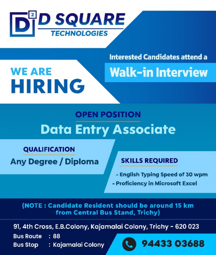 திருச்சியில் செயல்பட்டுவரும் DSquare நிறுவனத்தில் டேட்டா என்ட்ரி ஆப்ரேட்டர் பணிக்கு 25க்கும் மேற்பட்ட நபர்கள் தேவைப்படுகின்றனர். மேலும் விவரங்களுக்கு கீழே உள்ள படத்தில் காணலாம்.