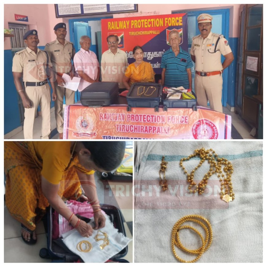 இன்று (30.01.2025) குறிப்பிட்ட இரண்டு பயணிகளான சென்னையை சேர்ந்த ஓய்வு பெற்ற வங்கி மேலாளர் காசிநாதன் மற்றும் ஸ்ரீரங்கத்தை சேர்ந்த ஓய்வு பெற்ற அரசு அதிகாரியான ராஜகோபாலன் ஆகியோரை கண்டறிந்து திருச்சி RPF நிலையம் அழைத்து வந்தனர். பின்னர் ரூபாய் 10 லட்சம் மதிப்புள்ள தங்க, வைர நகைகளையும் பட்டு புடவைகளையும் மீட்டு உரிய நபரான L.ராஜகோபாலனிடம் முறையாக ஒப்படைத்தனர்.