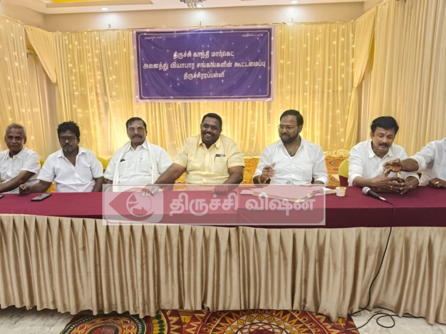 திருச்சி பழைய பால்பண்ணை அருகே உள்ள திருமண மண்டபத்தில் காந்தி சந்தை வியாபாரிகள் கூட்டமைப்பினர் மூன்று கோடி கூட்டம் நடத்தின இதில் பல்வேறு முடிவுகள் எடுக்கப்பட்டது.முக்கியமாக மே 9 தமிழ்நாடு முதலமைச்சர் ஸ்டாலின் பஞ்சப்பூரில் புதிய காய்கறி சந்தைக்கு அடிக்கல் நாட்ட இருக்கிறார். இதற்கு எதிர்ப்பு தெரிவித்த