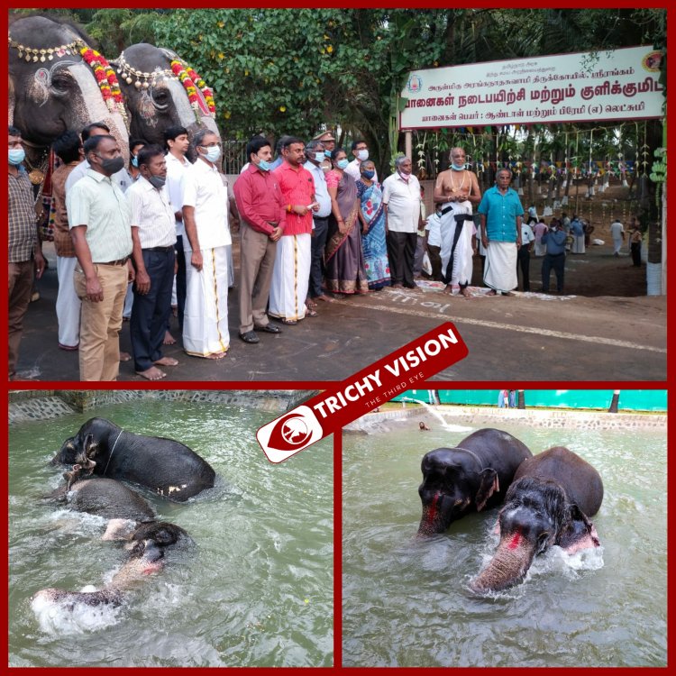 இன்று யானைகள் நடைபாதையும், குளியல் தொட்டியும் முறைப்படி பயன்பாட்டிற்கு கொண்டு வரும் நிகழ்வு நடந்தது.அலங்கரிக்கப்பட்ட இரண்டு யானைகளும், மேள, தாளங்கள் முழங்க, ஊர்வலமாக உடையவர் தோப்பிற்கு அழைத்து வரப்பட்டு, நடைபாதை, குளியல் பயிற்சிகள் துவங்கின.இந்நிகழ்வில், கோயில் இணை ஆணையர் மாரிமுத்து, தலைமை அர்ச்சகர் சுந்தர் பட்டர் உள்ளிட்டோர் பங்கேற்றனர்.