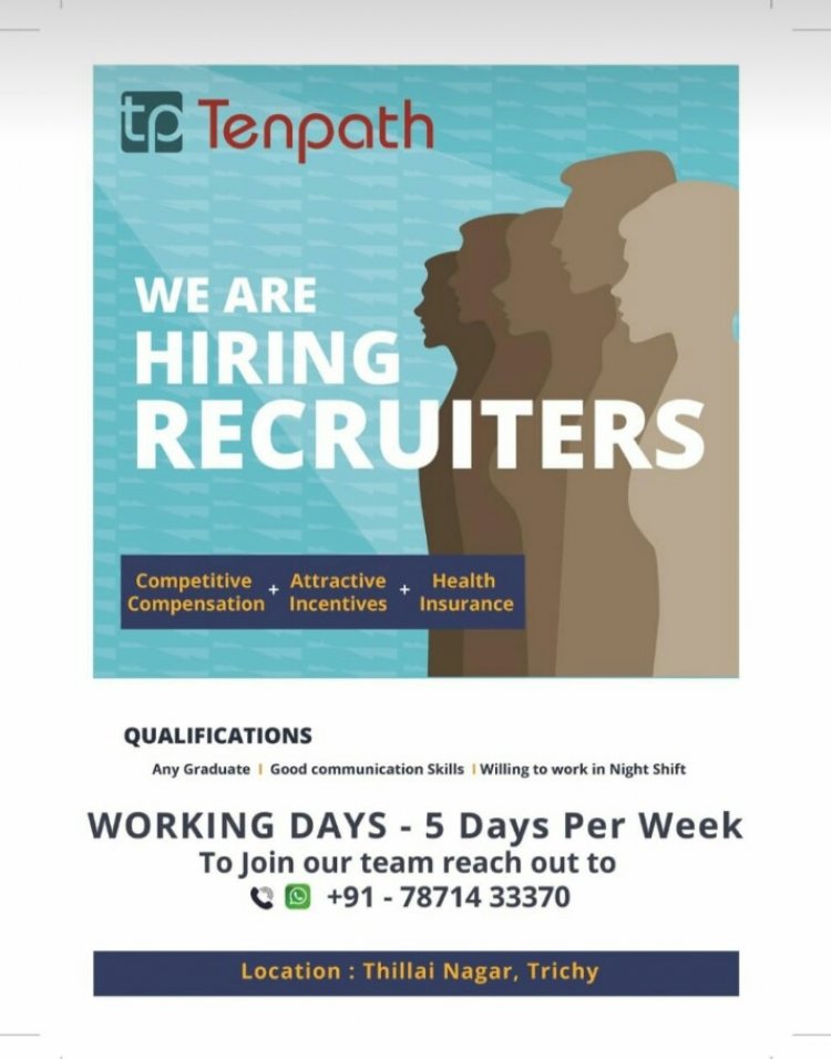 திருச்சி தில்லைநகரில் இயங்கி வரும் Tenpath ஐ.டி நிறுவனத்தில் பணிபுரிய டிகிரி முடித்தவர்களும், நன்றாக மொழித்திறன் உரையாடும் வல்லமை பெற்றவர்களும் பகல் இரவு நேர பணிக்கு விருப்பம் உள்ளவர்களும் விண்ணப்பிக்கலாம் . தகுதிக்கேற்ப சம்பளம், ஊதிய உயர்வு, காப்பீடு மற்றும் சலுகைகள் வழங்கப்படும். வாரத்தில் ஐந்து நாட்கள் மட்டுமே பணி. உங்களுடைய சுய விபரங்களை கீழ்க்கண்ட கைப்பேசி (78714 33370 )எண்ணில் மூலமாக அனுப்பலாம் அல்லது தொடர்பு கொள்ளலாம்.