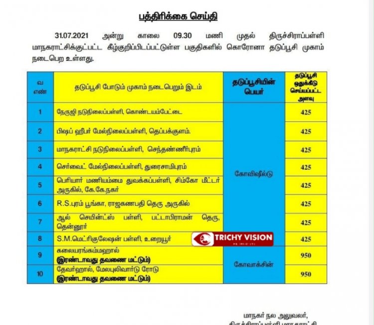 திருச்சி மாநகரில் நாளை (31.07.2021) கோவாக்சின், கோவிசில்டு தடுப்பூசி போடப்படும் என மாநகராட்சி அறிவிப்பு