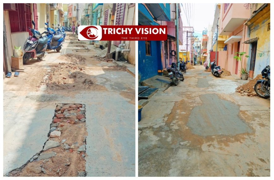 திருச்சி மாநகராட்சியில் வார்டு 33,(துணை மேயர் திவ்யா தனக்கொடி வார்டு, செக்கடித் தெரு) இந்த வார்டில் தண்ணீர் குழாய் பதிக்கும் பணி முடிந்து ஒரு மாதம் ஆகிவிட்டது. தெருவில் தோண்டிய பள்ளங்கள் சரியாக மூடாமல் இருந்தது.