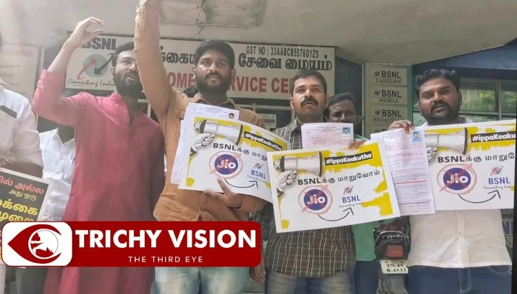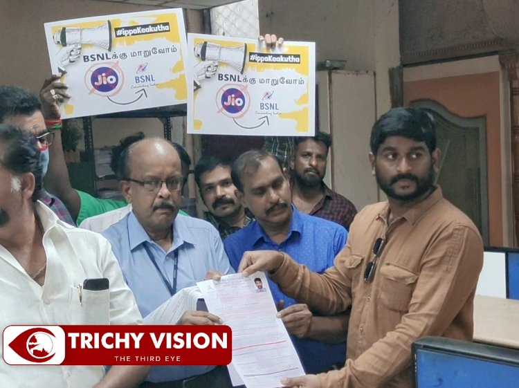 திருச்சி பிஎஸ்என்எல் அலுவலகத்திற்கு முன்பாக சுமார் பத்திற்கும் மேற்பட்ட திருச்சியைச் சேர்ந்த இளைஞர்கள் ஒன்றிணைந்து தாங்கள் உபயோகித்து வந்த ஜியோ சிம்மை பிஎஸ்என்எல்-க்கு மாற்றினர்.