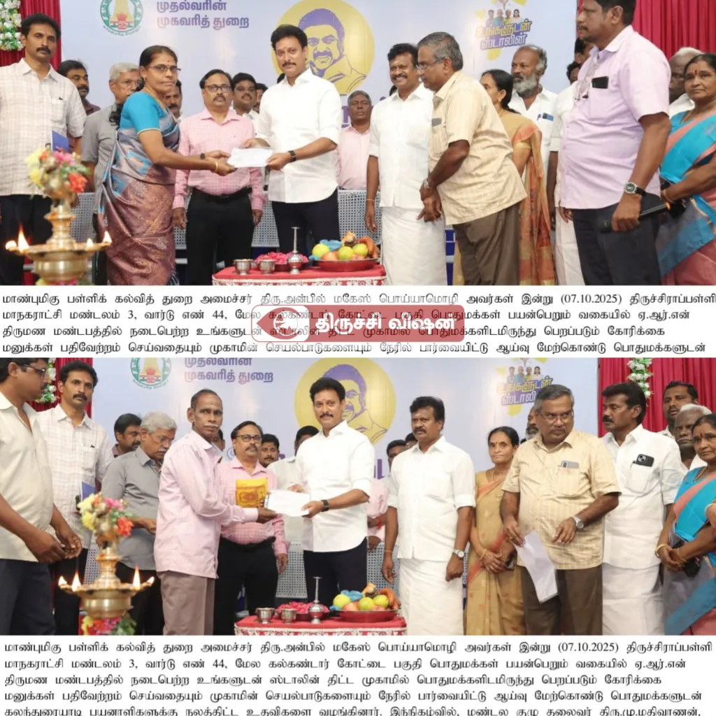 மாண்புமிகு பள்ளிக் கல்வித் துறை அமைச்சர் திரு.அன்பில் மகேஸ் பொய்யாமொழி அவர்கள், மாண்புமிகு தொழிலாளர் நலன் மற்றும் திறன் மேம்பாட்டு துறை அமைச்சர் திரு.சி.வெ.கணேசன் அவர்கள் ஆகியோர் இன்று (07.10.2025) திருச்சிராப்பள்ளி மாவட்ட ஆட்சியர் அலுவலக கூட்ட அரங்கில் நடைபெற்ற தொழிலாளர் நலன் மற்றும் திறன் மேம்பாட்டு துறையின் சார்பில் திருச்சிராப்பள்ளி பெருமண்டலத்திற்குட்பட்ட மாவட்டங்களில் பணிபுரியும் அலுவலர்களின் பணி திறனாய்வு கூட்டத்தில் அமைப்புசாரா தொழிலாளர் நல வாரியங்களில் பதிவு செய்துள்ள 17015 உறுப்பினர்களுக்கு ரூ.4.23 கோடி மதிப்பீட்டிலான நலத்திட்ட உதவிகளை வழங்கி விழா பேருரையாற்றினார்கள்.