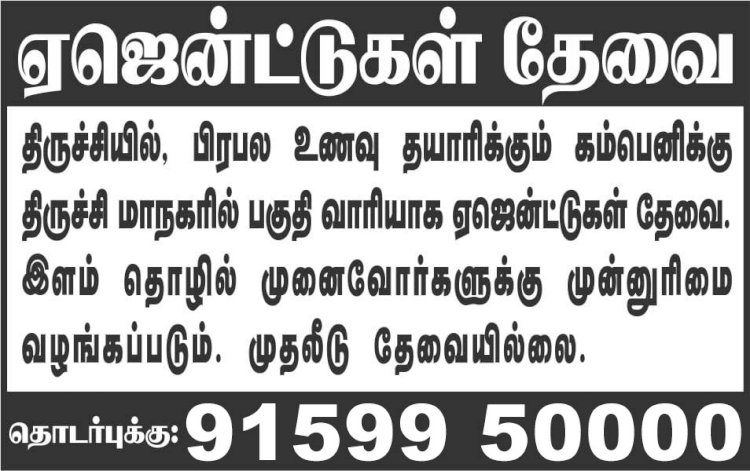 திருச்சி மாநகரில் பகுதி வாரியாக பிரபல உணவு தயாரிக்கும் கம்பெனிக்கு ஏஜெண்டுகள் தேவைப்படுகின்றன. கீழே உள்ள படத்தின் தொடர்பு எண்ணை தொடர்பு கொள்ளலாம்.