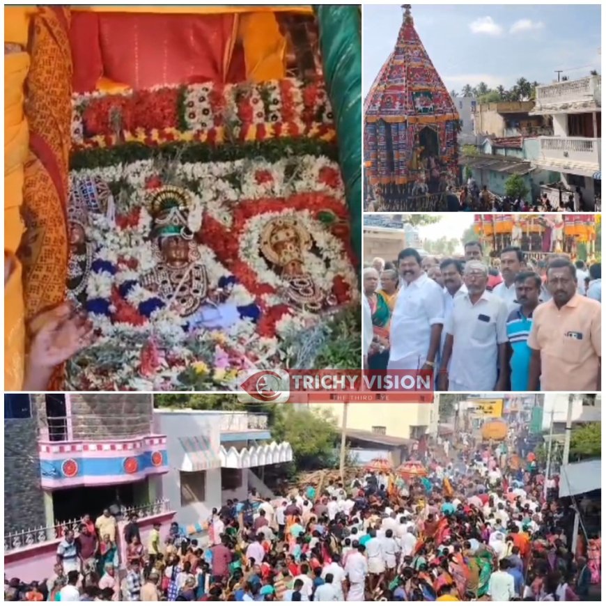 விழாவை முன்னிட்டு தினந்தோறும் சுவாமிக்கு பூஜைகள் நடைபெற்று பல்வேறு அலங்கார வாகனங்களில் சுவாமி திருவீதிவுலா நடைபெற்று வந்தது. இத்திருவிழாவின் முக்கிய நிகழ்வான திருத்தேரோட்டம் இன்று காலை கைலாய வாத்தியங்கள் முழங்க நடைபெற்றது. இதில் திருத்தேரின் வடத்தினை முசிறி தொகுதி எம்எல்ஏ காடுவெட்டி தியாகராஜன் மற்றும் ஏராளமான பக்தர்கள், பொதுமக்கள் பிடித்து இழுத்து முக்கிய வீதிகள் வழியாக சுற்றி வந்தனர். முன்னதாக சிவனடியார்கள் தேருக்கு முன்பு கைலாய வாத்தியங்கள் வாசித்தும், பெண்கள் கும்மியடி, கோலாட்டம் ஆடி மகிழ்ந்தனர்.