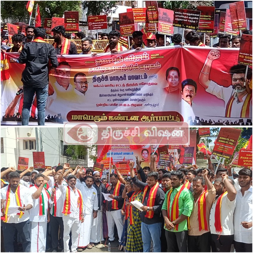 வக்பு மசோதாவுக்கு எதிர்ப்பு தெரிவித்து தமிழக வெற்றி கழகம் சார்பில் திருச்சியில் மாவட்ட ஆட்சியர் அலுவலகம் அருகில் மாபெரும் கண்டன ஆர்ப்பாட்டம் – 300-க்கும் மேற்பட்டோர் கலந்து கொண்டு மத்திய அரசுக்கு எதிராக கண்டன கோஷங்களை எழுப்பினர்