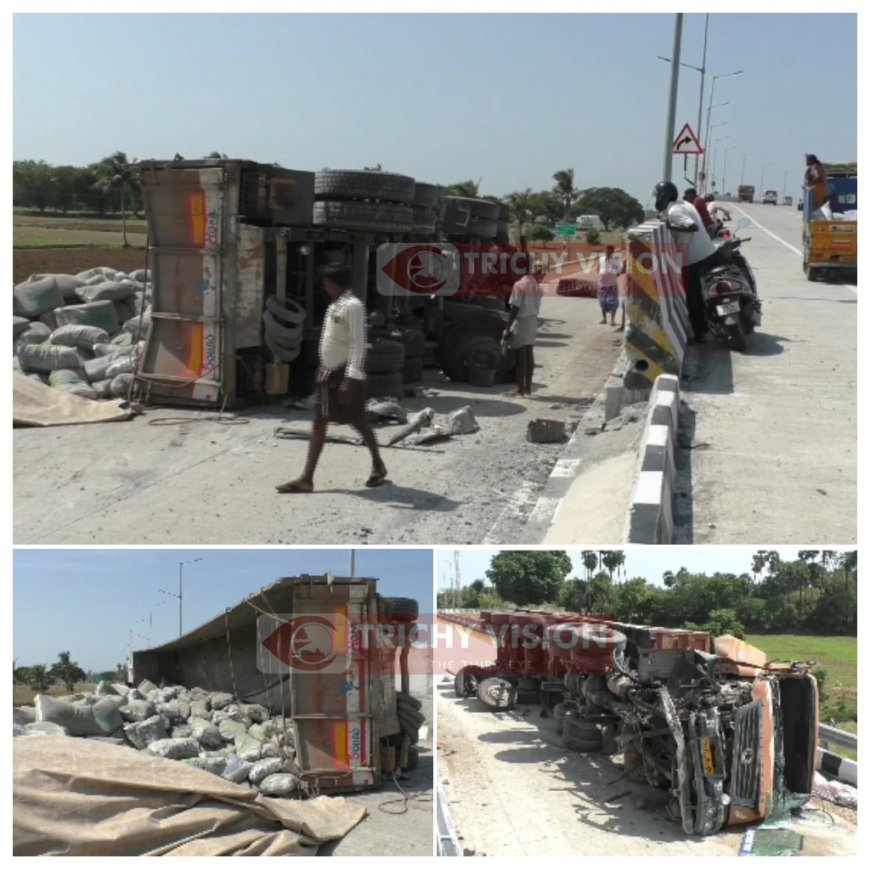லாரியில் சுமார் 30 டன் சிமெண்ட் மூட்டைகள் இருந்துள்ளன. இந்த நிலையில் திருச்சி மாவட்டம் லால்குடி அருகே இ.வெள்ளனூர் பகுதியில் உள்ள திருச்சி – சிதம்பரம் தேசிய நெடுஞ்சாலையில் வந்து கொண்டிருந்தபோது திடீரென்று லாரியின் நடுப்பகுதியில் உள்ள டயர் வெடித்தது. இதனால் லாரி டிரைவரின் கட்டுப்பாட்டை இழந்து சாலையில் தறி கெட்டு ஓடியது.