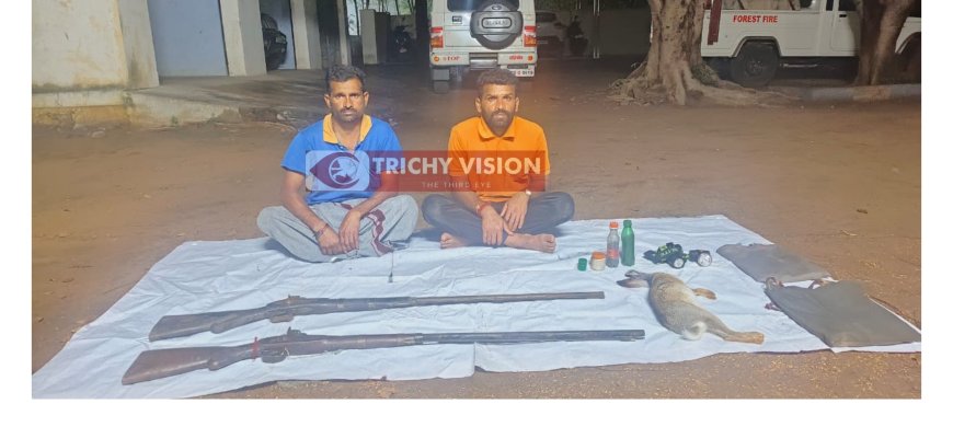 அவர்கள் வேட்டையாடிய ஒரு முயல் இரண்டு சுடுவதற்கு பயன்படுத்தக்கூடிய பால்ரஸ் குண்டுகள் மற்றும் தலைக்கவச விளக்கு ஆகியவற்றை பறிமுதல் செய்த வனத்துறையினர் இருவரையும் நீதிமன்றத்தில் ஆஜர்படுத்தினர்.